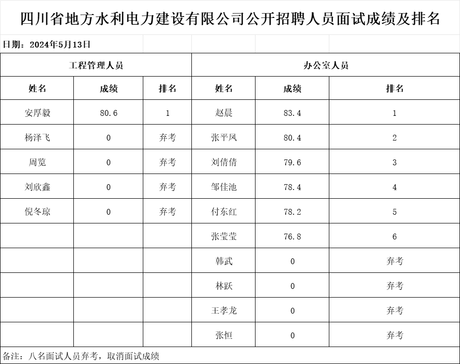 四川省地方水利電力建設(shè)有限公司公開(kāi)招聘人員面試成績(jī)及排名