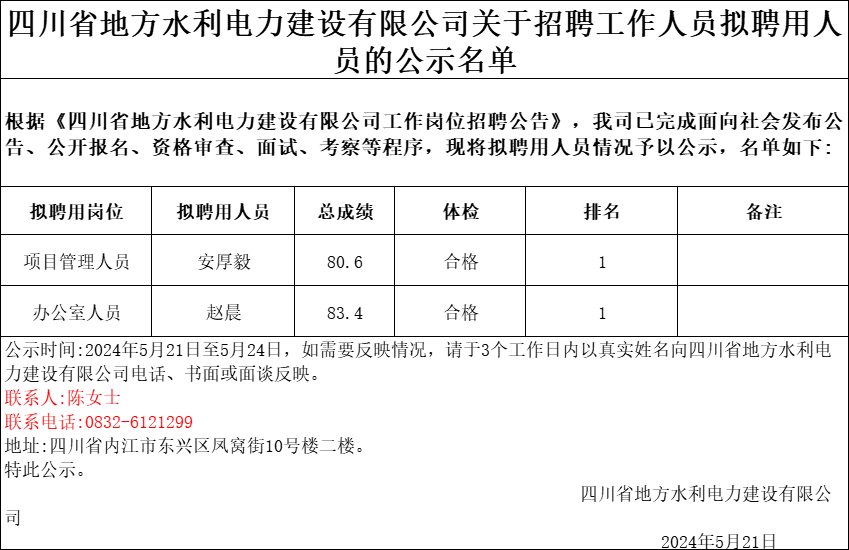 四川省地方水利電力建設(shè)有限公司關(guān)于招聘工作人員擬聘用人員的公示名單