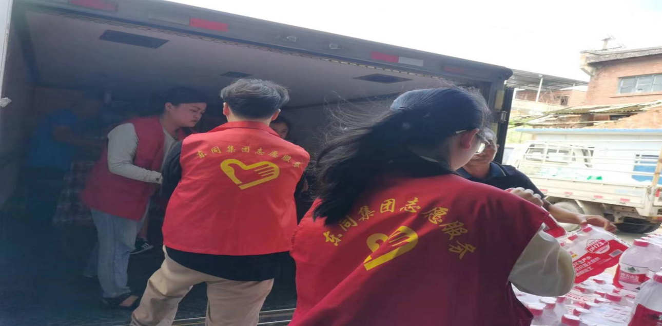 圖為 公司青年黨員志愿者和當?shù)卣藛T搬運物資
