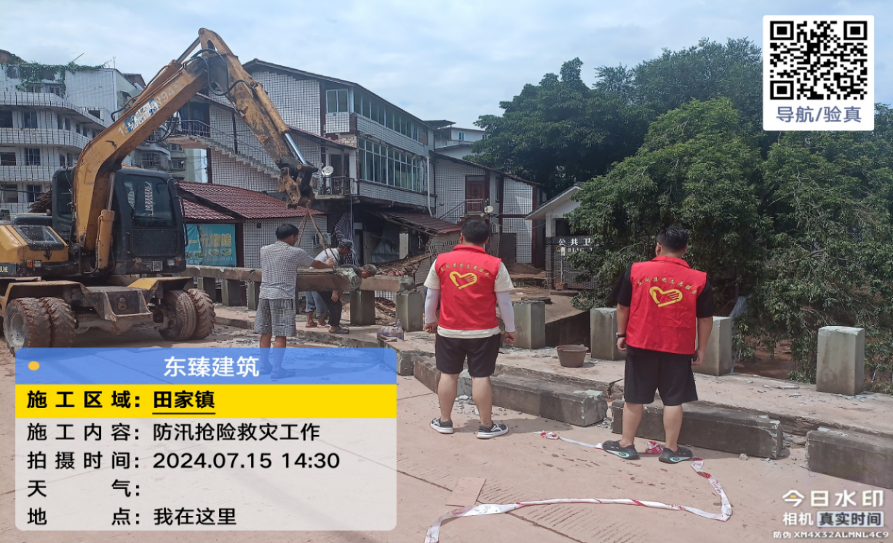 三、四川東臻建筑工程有限公司成立以總經(jīng)理羅宏為總指揮、以美鄉(xiāng)優(yōu)城項目各鎮(zhèn)街工作組的負責人為領隊、各部門協(xié)作的抗洪救災工作小組,預備參與搶險救災。集結(jié)救災人員上百人,分16個工作小隊,每隊配置志愿者8人,挖機1臺、裝載機1臺、渣土車3輛主動參與田家、郭北、順河、高梁、永福等16個鄉(xiāng)鎮(zhèn)防汛工作,按照指令緊張有序開展抗洪救災及災后重建工作。